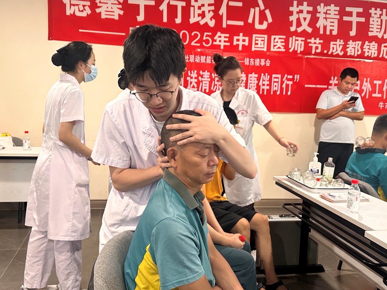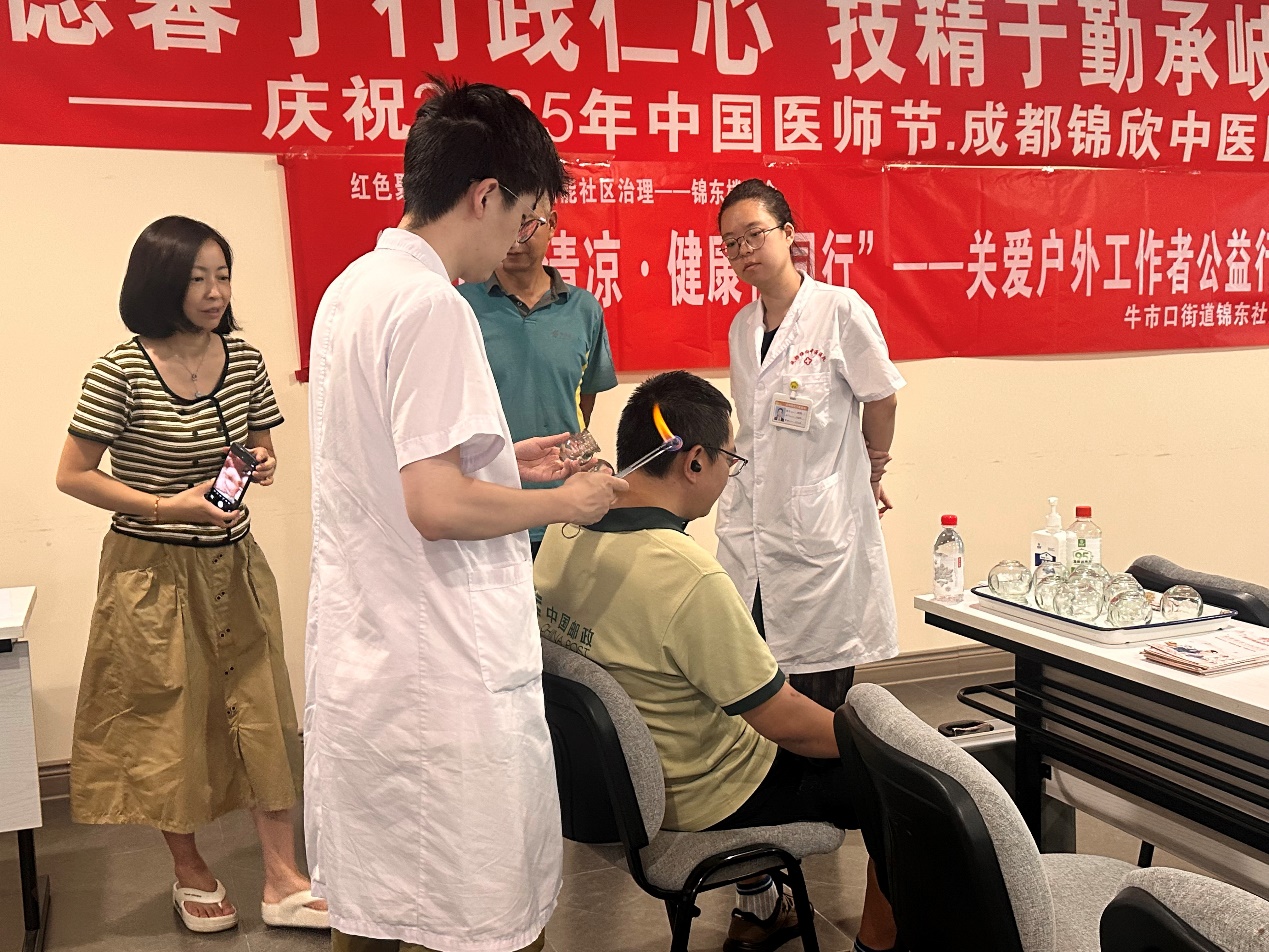 锦欣中医医院的医疗团队分工明确,中医问诊区前,医生仔细询问户外工作者的身体状况,给出个性化调理建议;理疗区里,按摩师娴熟地为大家做肩颈按摩、推拿拔罐,“按完之后脖子舒服多了,感觉整个人都轻松了!”快递员王师傅感叹道。耳穴埋豆处,护士细致地为大家贴上耳豆,“这个能缓解疲劳,改善睡眠,平时按压一下很方便。”现场不时传来阵阵感谢声,温暖的氛围驱散了夏日的燥热。